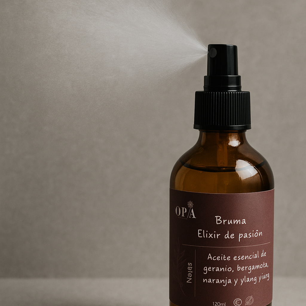Bruma Afrodisíaca: agua destilada con aceites esenciales de geranio, bergamota, naranja y ylang-ylang, junto a glicerina y vitamina E